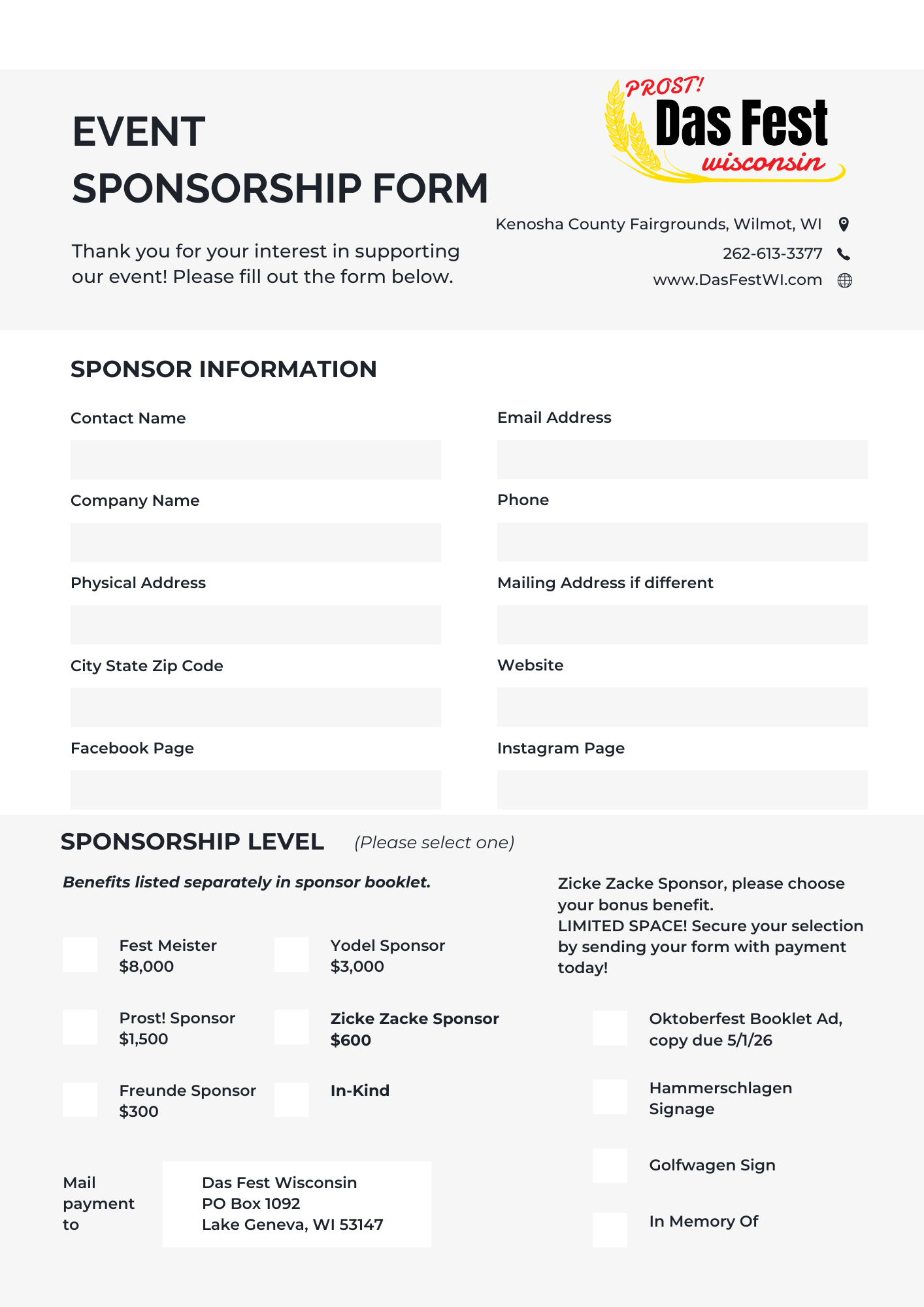 If you have an Oktoberfest, you want to be in the book. Check the Oktoberfest booklet box on the sponsorship form. It is included with the Zicke Zacke sponsorship for $600. This is a 4.75 x 4.75 full page, full color advertisement with copy due 5/1/26. You'll also receive a listing on our website (a special Oktoberfest page with links will be published), social media promotion, and 25 tickets to Das Fest. SPACE IS LIMITED!